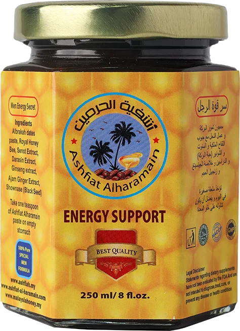 Ashfiat Alharamain is a powerful and revitalizing blend specifically crafted to naturally enhance and elevate energy levels throughout the body. Recognized for its ability to serve as an effective natural energy booster, this unique formula is carefully composed of a selection of potent, nutrient-rich ingredients known for their healing and energizing properties. Among these ingredients are ginseng roots, renowned for their adaptogenic qualities that help combat fatigue and improve stamina; Arabian date paste, which provides a natural source of energy and essential nutrients; black seed extract, celebrated for its immune-boosting and restorative properties; and royal honey, a rich source of enzymes and natural sugars that further support vitality.
